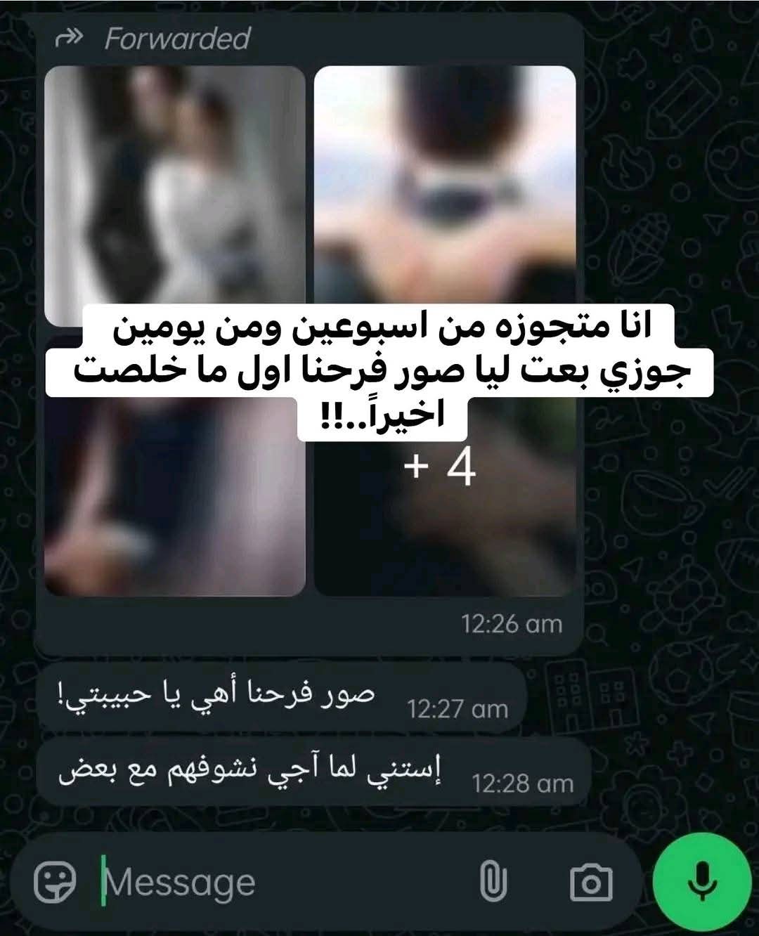 أنا متجوزه من أسبوعين ومن يومين جوزي بعت ليا صور فرحنا أول ما خلصت أخيرا كنت متحمسة أوي إني أشوفهم هو كمان كان متحمس أوي كان باين جمالهم من أول صورتين كنا حلوين جدا وقبل ما أفتحهم لقيته بعت ليا رسالة كتب فيها الصور أهي خلصت بس أوعي تفتحيهم لوحدك إستني لما أروح نشوفهم سوا! الساعة 12 ونص دلوقتي بس إنت هتتأخر أكتر من كده زي كل يوم! يا ستي مش هتأخر النهاردة إنت عارفة طبيعة شغلي أعمل إيه! وعد يعني!