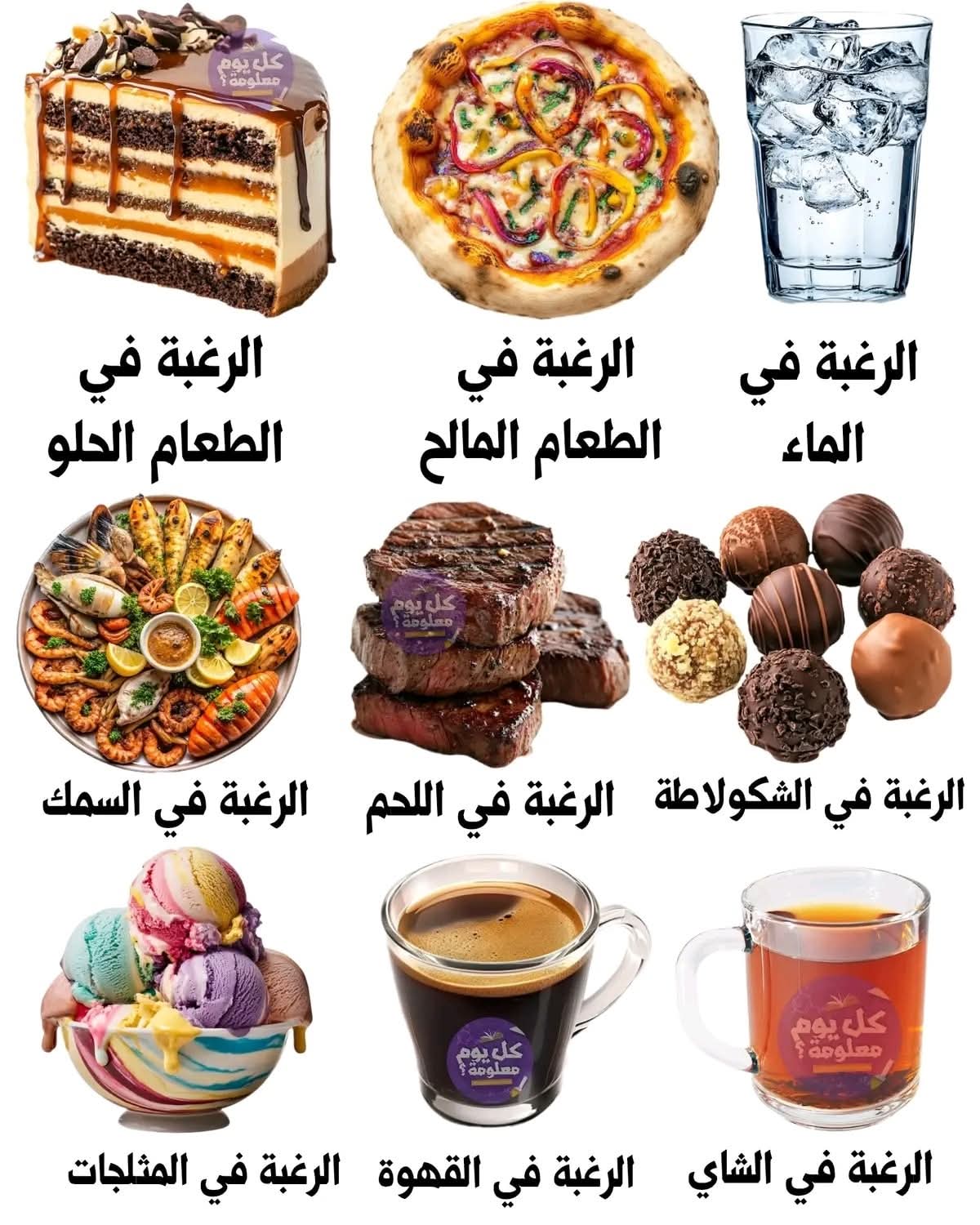 الر,غبة في الماء في الطعامفي الطعام في الشكولاتة الرغبة في اللحم في السمك الرغبة في الشاي في القهوة
