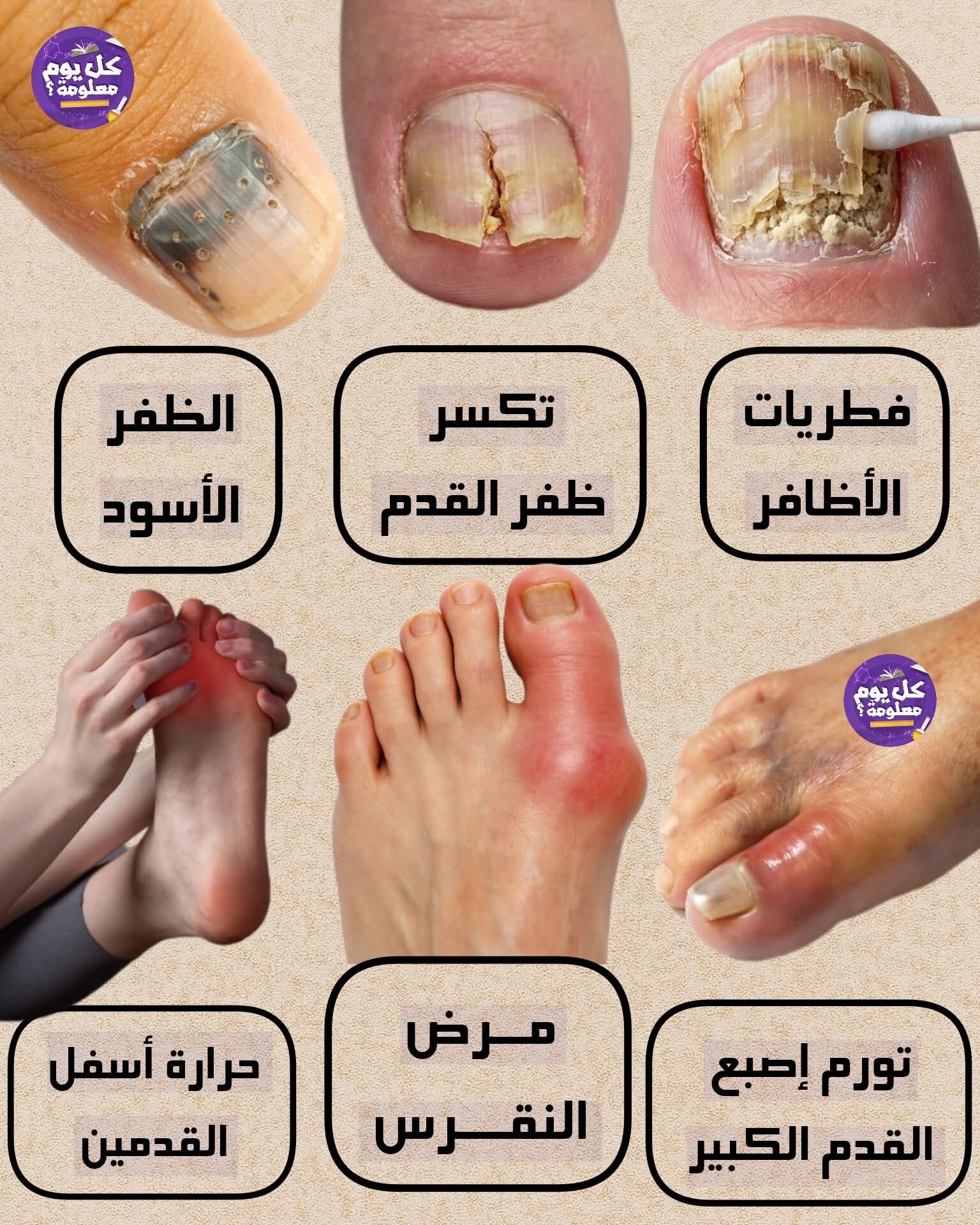 صحة جلدنا وأظافرنا ومفاصلنا هي مرآة تعكس صحتنا العامة. في كثير من الأحيان، نتجاهل بعض العلامات والأعراض التي قد تبدو بسيطة، ولكنها قد تكون مؤشرًا على مشاكل صحية تحتاج إلى اهتمام. الصورة التي بين أيدينا تسلط الضوء على ست حالات طبية شائعة تواجه الكثير من الناس: التهاب حول الأظافر، هشاشة الأظافر، تشققات القدمين، ثآليل الرقبة، اصفرار الأظافر، والتهاب النقرس المفصلي. في هذا المقال، سنستعرض أسباب كل حالة وطرق علاجها والوقاية منها.