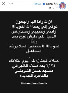 واكد حمادة رضا في منشور عبر خاصية ستوري خبر الوفاة قائلا انا لله وانا اليه راجعون توفى الى رحمة الله اخويا وابني اللي مليش غيره بعد ربنا معبرا عن حزنه الشديد على رحيله.
